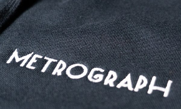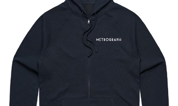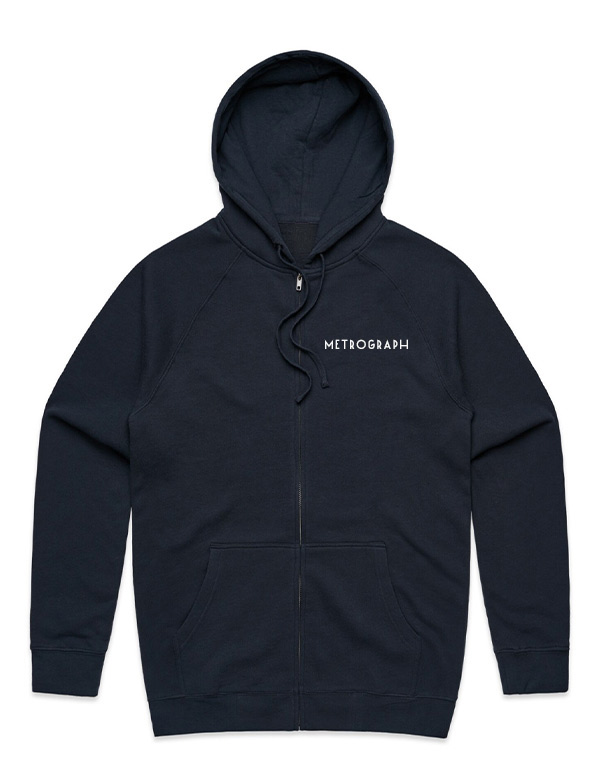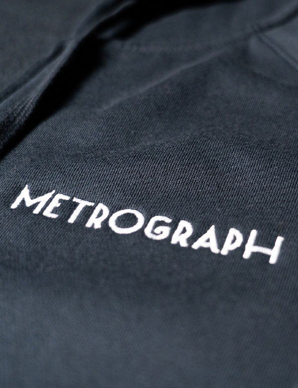 Mid-weight hoodie in navy with our embroidered Metrograph logo, for wintertime outdoors and at home.